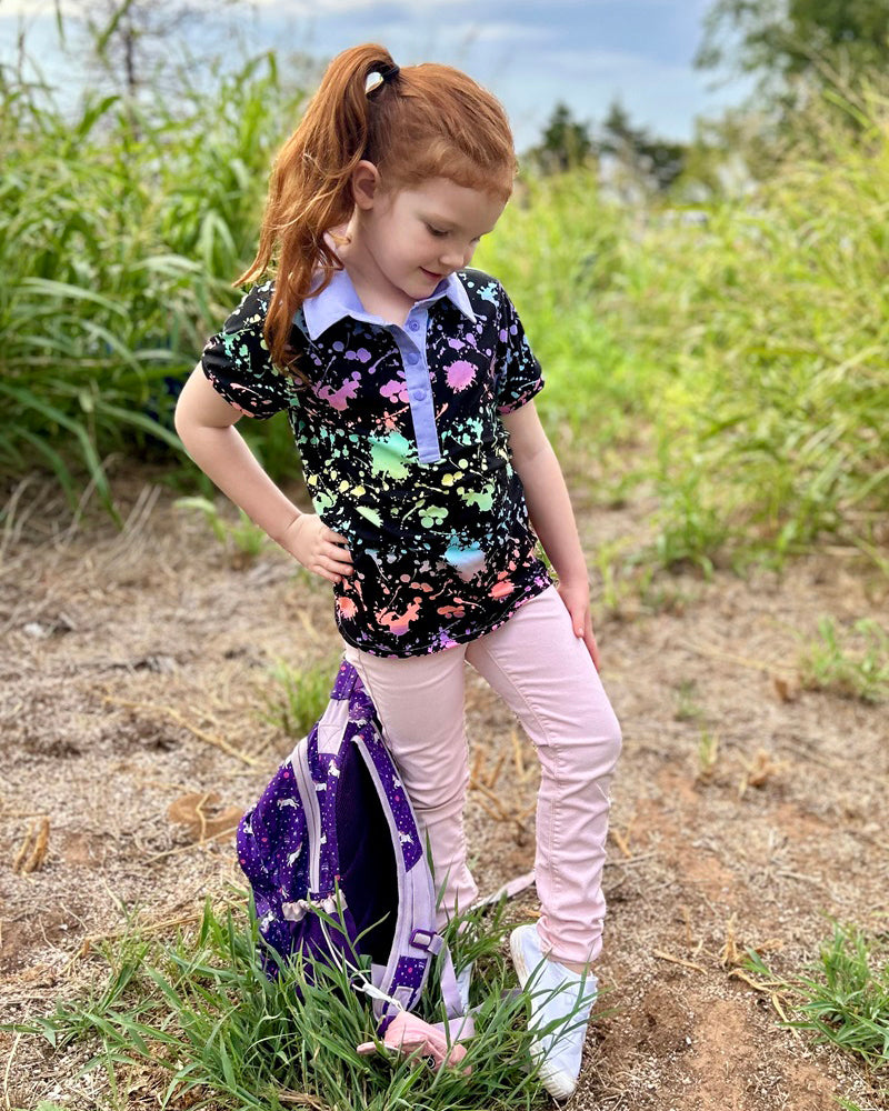 Whether you want to make a classic polo or an over-the-top ruffled polo, you are going to love this pattern! Brandi's features short or long sleeves, a regular or peter pan collar, and optional ruffles around the placket. Plus, you can choose buttons or snaps. With all these options you have so many variations you can make with just one pattern! Use your favorite knit prints for a comfy everyday play shirt, and because it has a collar it also works perfectly for more formal occasions too!