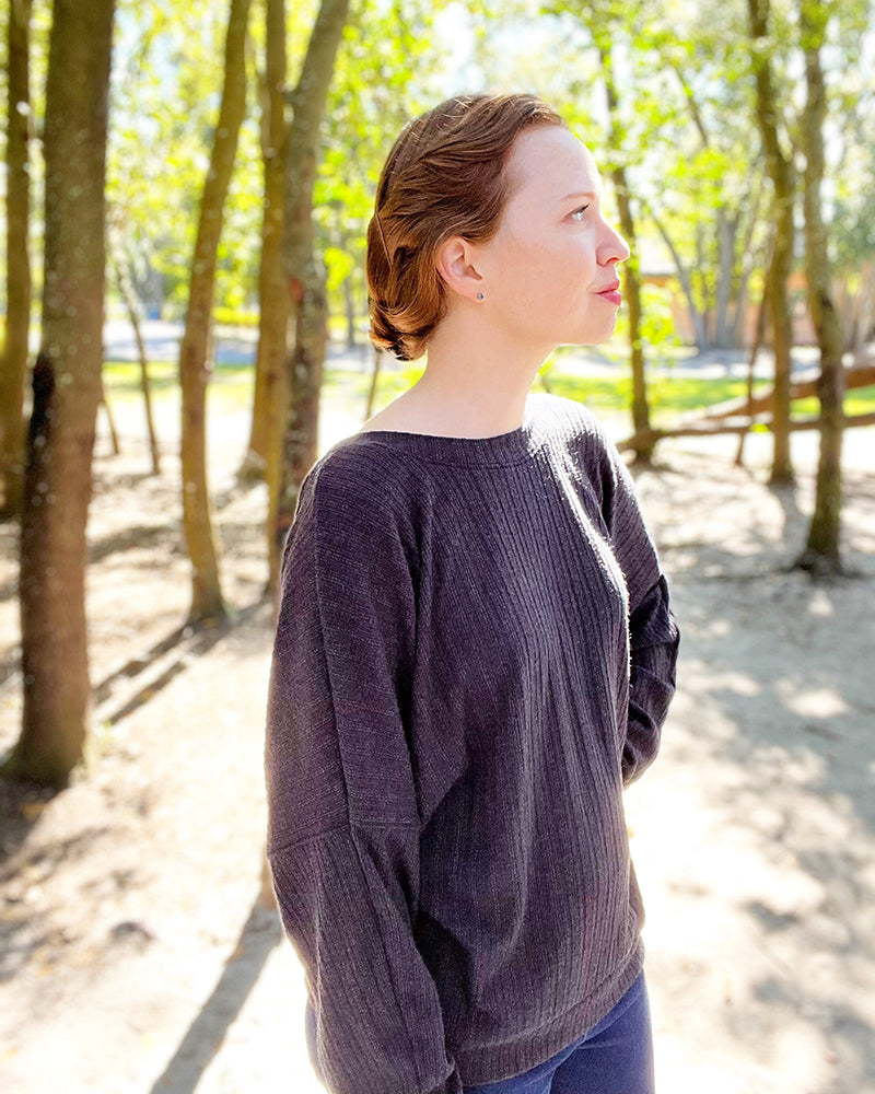 Recommended fabric: Sweater, sweatshirt, or sweater fleece fabric with 30-75% stretch and also good recovery. Cable knits and thick rib knits with proper stretch and recovery.