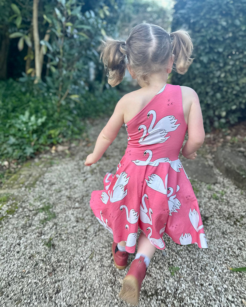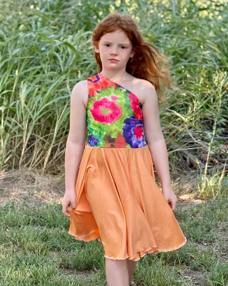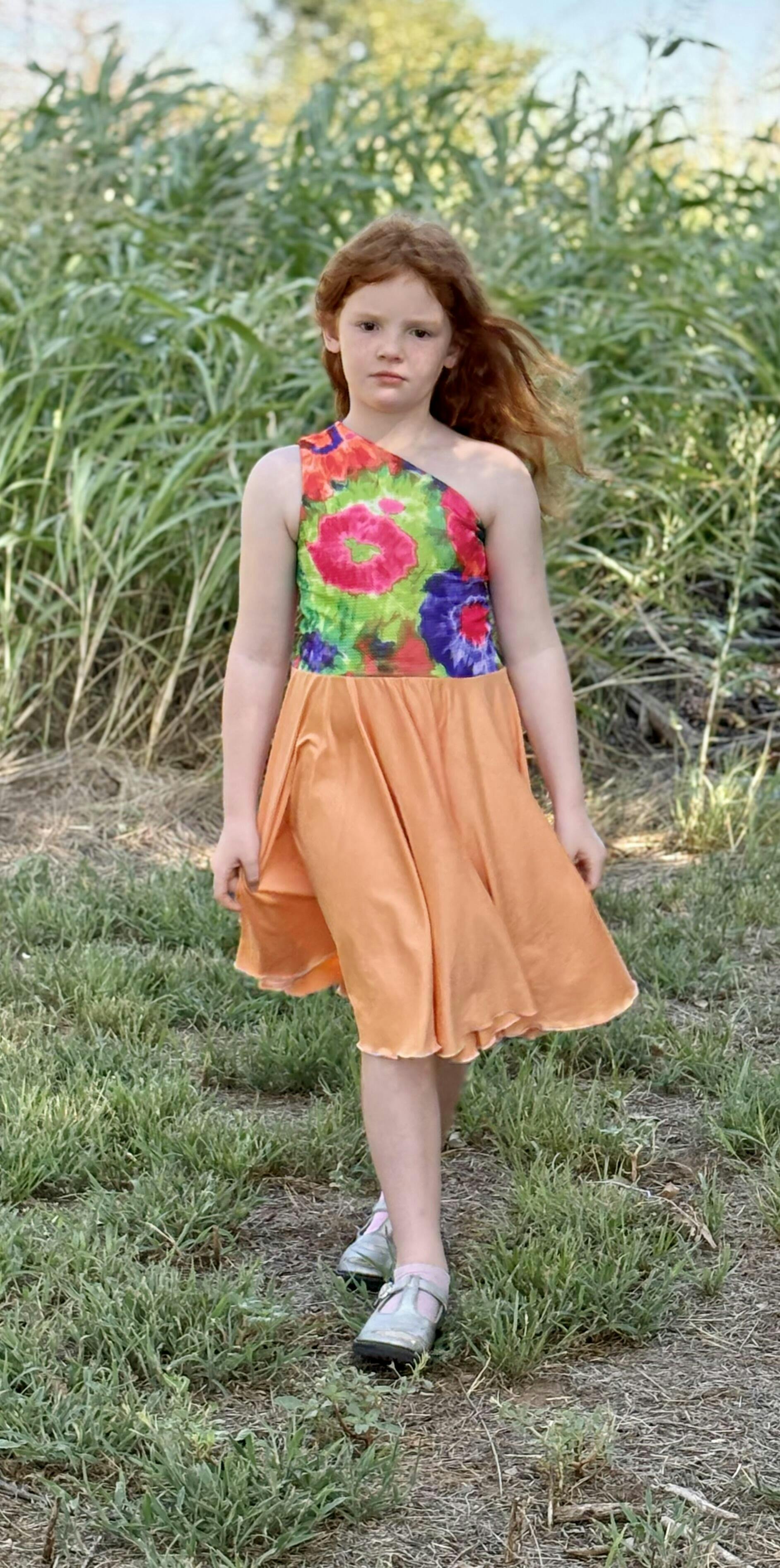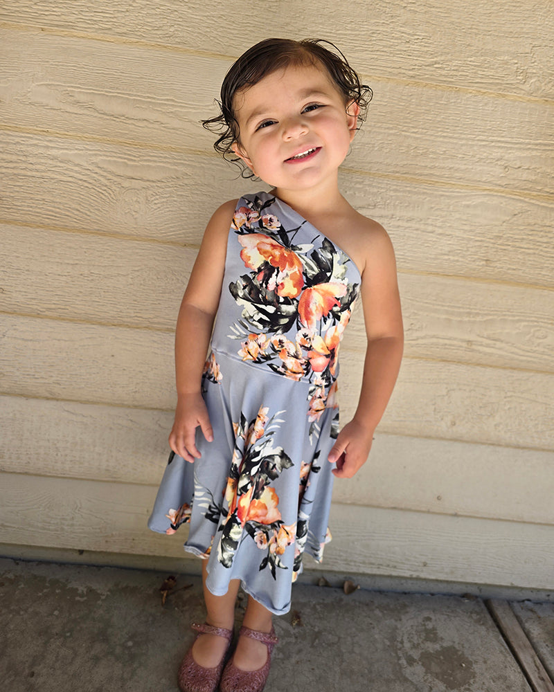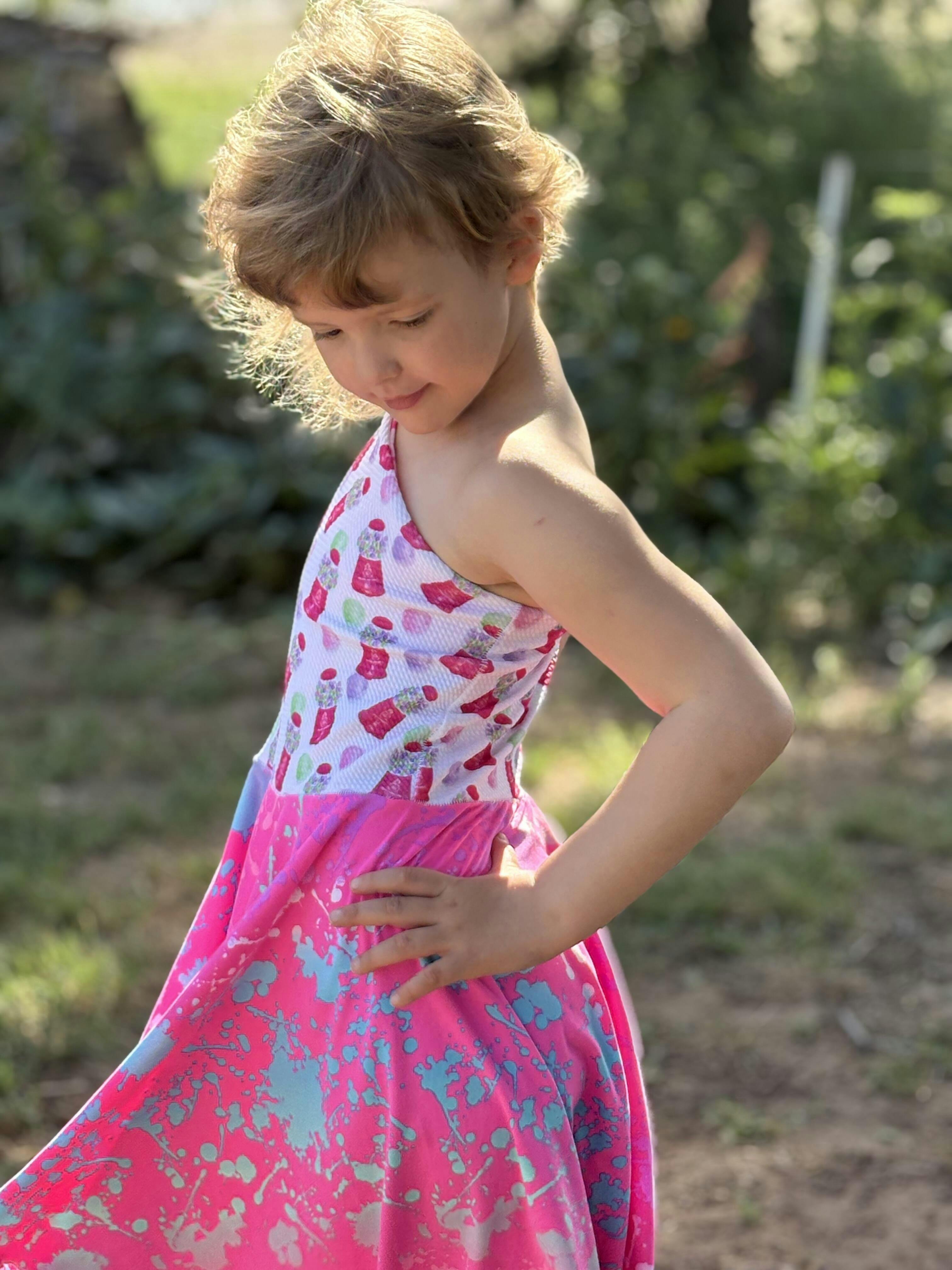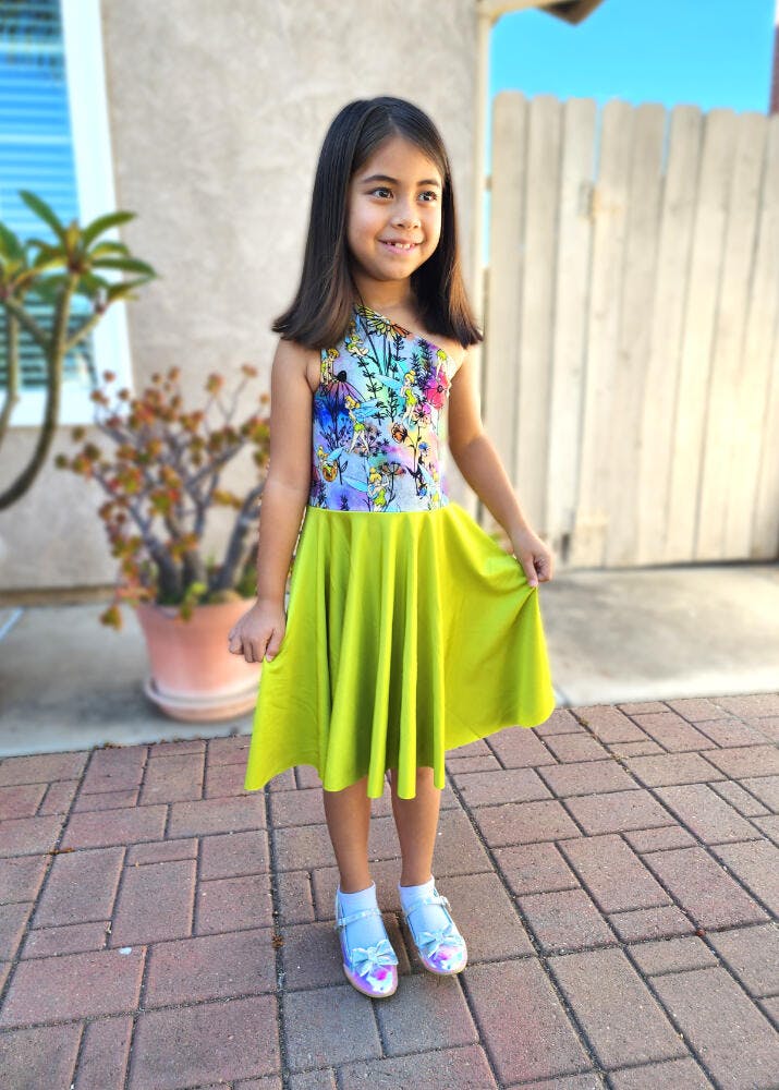 If you're looking for a unique dress that your little one will love to wear, this dress is it! Madelyn's features a fitted one-shoulder bodice that is fully lined, and a circle skirt that is comfy at the waist and ideal for twirling! And best of all (for you), it is a super quick and easy sew! No bands, no gathering; it's a breeze! The bodice has great coverage and modesty if you choose fabrics that are medium weight. The pattern has different pieces for front and back and creates a snugness that helps hold the dress in place. Madelyn's is perfect for special occasions or a trip to the park, and your little one will want one for every day of the week!