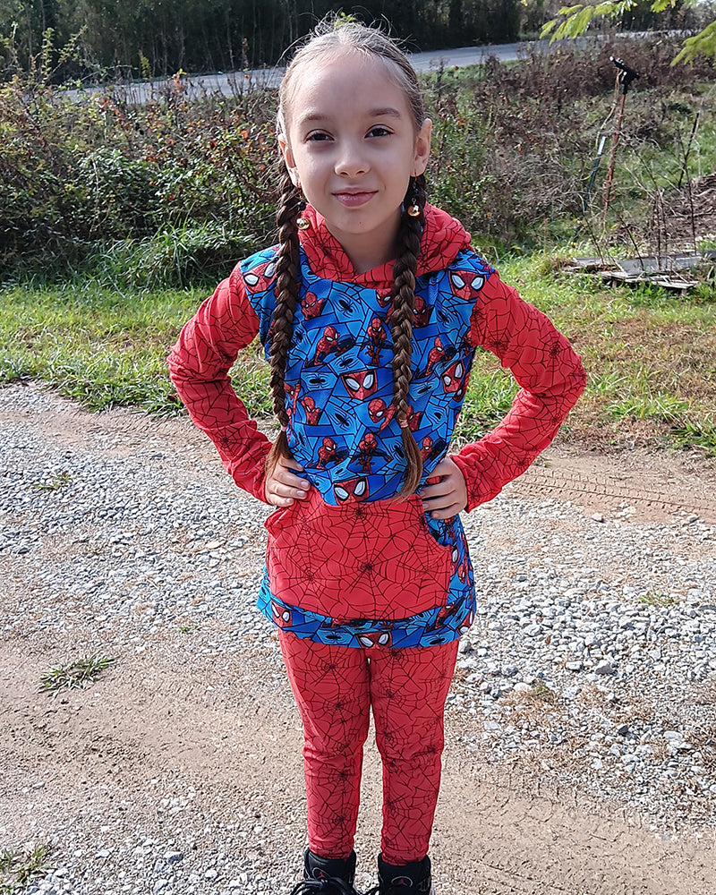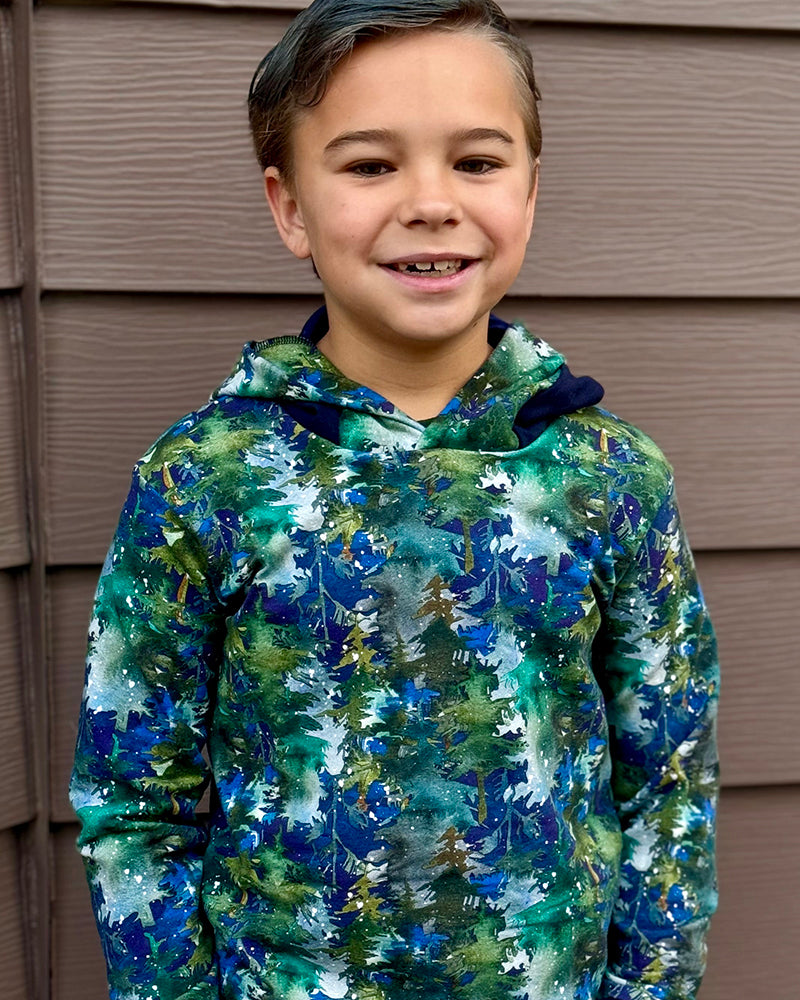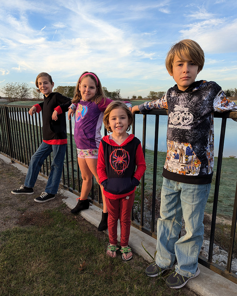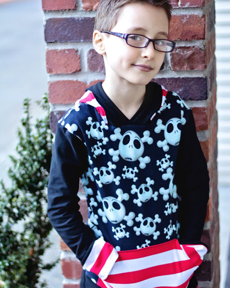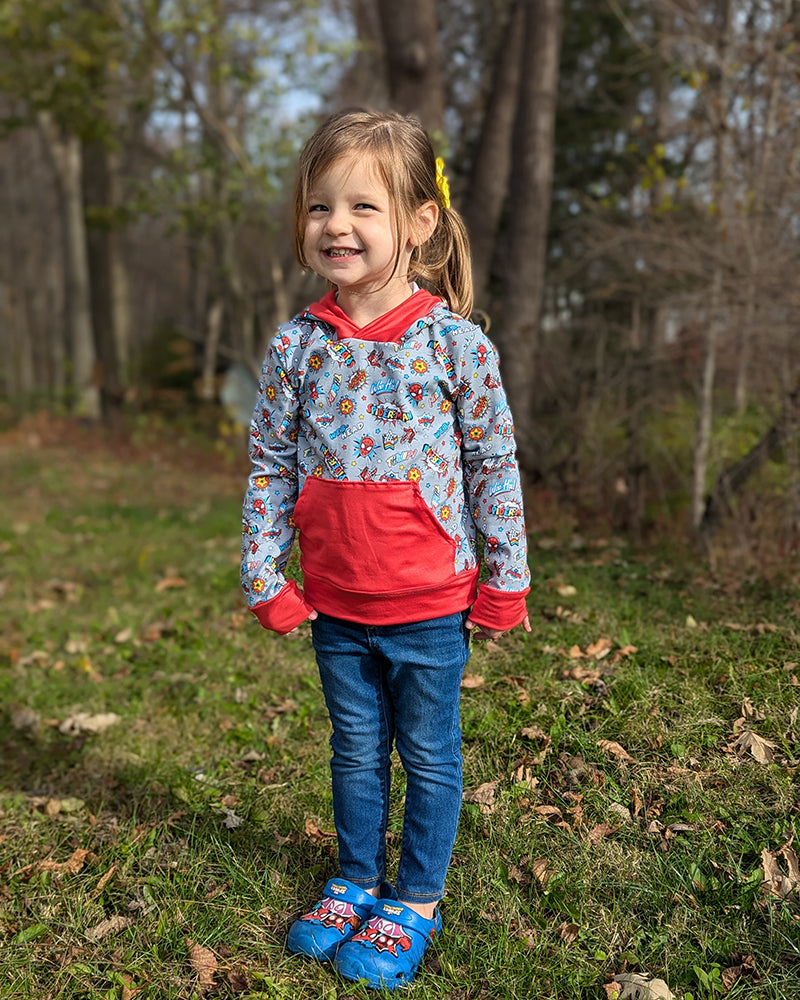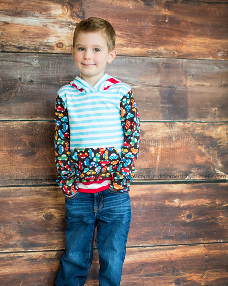This hooded t-shirt is going to be a favorite for your little one! Toby's has the comfy fit of a t-shirt (not a hoodie), so there's no need for layering and it's perfect for any weather! It features two sleeve lengths with cuffs, a waistband that can be either shirt-width or fitted, a hoodie-style pocket, and of course an adorable hood with a trim band. The easy construction makes this shirt a super quick sew, and all the details make it extra fun for color-blocking or using panels. Toby's will be your new go-to pattern for casual tops!